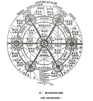 根据霍华德的设想,田园城市的模型呈圆形,中央是一个公园,有6条主干道路从中心向外辐射,把城市分为6个扇形区域。在其核心部位布置独立的公共建筑,在公园周围布置一圈玻璃廊道用作室内散步场所,与这条廊道连接的是一个个商店。在城市直径线的外1/3处设-条环形的林荫大道,并以此形成补充性的城市公园,在此两侧均力居住川地。在居民建筑地区中,布罝了学校和教堂。在城市的最外围地区建设各类工厂、仓库和市场,一面对着最外层的环形道路,一面对着环形的铁路支线(图1)。
