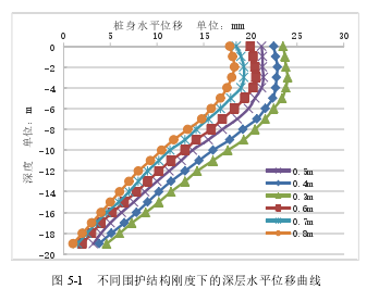 本文通过改变围护结构刚度来分析对基坑变形的影响。对围护结构的不同刚度进行模拟,上图 5-1、5-2 就对不同地连墙厚度 0.3m~0.8m 范围内的 6 个工况条件下的围护结构深层水平位移和周围地表沉降值进行模拟分析。
