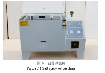盐雾试验被认为是模拟海洋大气对不同金属(有保护涂层或无保护涂层)最有用的试验室加速腐蚀试验方法[87]。其中应用最广泛的人工加速腐蚀方法为中性盐雾试验,即腐蚀溶液 PH 值范围为 6.5~7.2。本试验采用的盐雾试验机型号LX-90,温度控制器范围为 0~99℃,连续式喷雾,盐雾箱通过空气压缩机带动吸水,利用帕努特原理将盐水雾化,喷雾均匀。喷雾量就 80cm2而言为 1~2ml/h,采用玻璃喷嘴可调整喷雾量大小。将试验钢材试件放置试验箱内,试验时自动吸取盐溶液雾化后喷雾,最终盐雾落在试件表面,在钢材表面形成一层薄水膜进行电化学反应,以此用来模拟海洋大气腐蚀环境,试验机如图 2-1 所示。试验溶液为 5%NaCl(质量分数)溶液,pH 值范围为 6.5~7.2,试验时盐雾箱内的温度恒定在(35 士 1)℃。试验试件以竖直方向放置于盐雾试验向内,将主要腐蚀表面垂直于水平方向,以保证盐雾均匀落在试件表面并且试件之间互不接触。