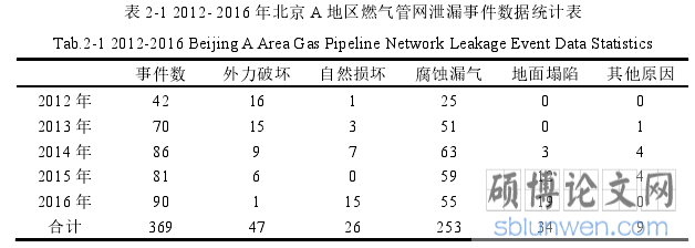 北京 A 地区燃气公司运行所辖区内现有中、低压燃气管线 1585 公里,根据该运行所燃气管网泄漏事件数据统计,2012 年至 2016 年期间,发生管道漏气事件 369 起,因第三方外力破坏造成的管道泄漏事件 47 起,占比 12.7%;由于腐蚀造成的管道泄漏 253起,占比 68.6%;地面塌陷造成的管道泄漏 34 起,占比 9.2%;自然损坏及其他原因造成的管道泄漏 35 起,占比 9.5%,统计结果如表 2-1 所示。由此可见,第三方外力破坏和管道的腐蚀破损是管道泄漏事件多发的主要原因。
