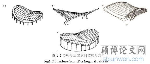 单根的悬索是一种几何可变结构,其平衡形式随荷载分布方式而变,特别是当荷载作用方向与垂度方向相反时,悬索就失去了承载能力。因此,需要布置一些索系或结构来提高屋盖结构的稳定性[3]。马鞍形索网结构由两组曲率相反的索形成,下凹的索为承重索,作用为承受屋面恒荷载和向下的活荷载;上凸的索为稳定索,作用为承受由风荷载产生的向上的吸力作用,两组索相交处由索夹连接,索网两端锚固在周边刚性构件上。图 1-2 给出了 4 中常见的马鞍形索网结构形式。由于两组索曲率相反,所以可以对其中一组或两组索进行张拉来在索网中建立预应力。当施加足够的预应力时,马鞍形索网便会具有良好的稳定性和刚度,施加配重后,承重索和稳定索共同工作,保持张力。马鞍形索网的边缘构件多采用闭合的空间曲梁,索网的水平力在空间曲梁内自平衡,在两组索的拉力作用下,空间曲梁为压弯构件。由于索网水平力由空间曲梁承受,对下部支承结构和基础的受力较为有利。