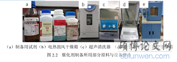所用到的设备主要有:50ml 规格带聚四氟乙烯内衬的高压水热反应釜,BPG-9070A 型精密鼓风干燥箱(上海一恒科学仪器有限公司),KQ-300E 型超声波清洗器(昆山市超声仪器有限公司)等。图 2.2 为催化剂制备实验中所用到的部分原料与设备的照片。