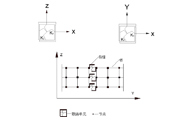 本文通过将整个裂缝接触面的集料嵌锁刚度离散到接触面上对应节点上,通过在对应节点对之间设置竖向弹簧来模拟两个接触面间的荷载传递[12,31]。采用此种方法每个节点可以独立计算,弹簧刚度容易计算出,模型的建立比较简单,得到的结果比较准确可靠,在模型中采用竖向弹簧模拟裂缝间的传荷能力。裂缝模型如图 2.1 所示