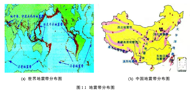 在众多的自然灾害中,地震是一种频发且破坏性强的自然灾害,是因地球内部结构发生运动而产生[1]。地震本身发生频率高且难以预测,一般分为构造地震:因地底的岩层相互错动或断裂产生,分布广泛,危害也最大;火山地震:该地震受地域限制仅在火山活动活跃区域发生,范围较小;陷落地震:因地面塌陷而导致局部的地震发生;诱发地震:人为因素诱发地震。地震集中发生频率较高的地方一般位于大陆板块的交界位置或板块内部断裂的地方,这些地带也被称作地震带,如图 1.1 所示。地球上的两个主要地震带是地中海、环太平洋地震带,两个地震带释放的能量,约占全球所有地震释放能量的 98%[2]。中国就位于这两个地震带的中间,导致我国所遭受到的地震强度和频度都居世界首位。