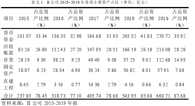 表 3.1 H 公司 2015-2019 年各项主要资产占比(单位:亿元)