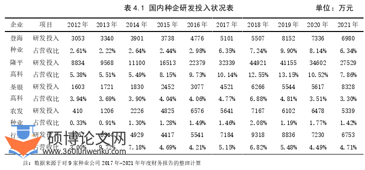 “粮安天下,种铸基石”。种子是关系我国粮食安全的关键一环,种企应当培育具有自主知识产权的优良品种,而关注种企的研发投入以及其能转化形成的效益就显得具有重要性和必要性。本文为了研究我国种业上市公司中的研发投入和其产生的效益,选取了在深交所主板上市的种企登海种业作为研究对象,依据公司和行业内共9家上市种企在2012-2021年披露的年度报告和CSMAR数据库中的数据,在案例分析章节进行了研发投入分析和研发投入效益的影响分析,并得出以下与种企相关的结论。