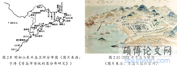 青岛对海洋的利用最早可追溯到新石器时代,海洋生物最早作为青岛先民赖以生存的物质需要,至唐宋时期青岛经济文化有所发展,自明代成为海防要塞,在沿海各处设立卫、所海防重镇(图 2.9),浮山前所(今浮山所)便是其中重要的海防军事机构之一。青岛城区以自然村落为单位散布在南部沿海一带,滨海区域规模较大的村落有会前村、青岛村、浮山村等。清军进驻后,建设了一批如总兵衙门、兵营、军火库及前海码头等军事设施和相关设施,其他市政基础设施的建设几乎是空白。根据以上信息和德军占领前青岛城市面貌的写景地图(图 2.10)可以看出,建置时期青岛主城区对滨海岸带的利用呈现散落分布的特点,仅青岛湾和浮山湾一带作为较为重要的城市建设用地。