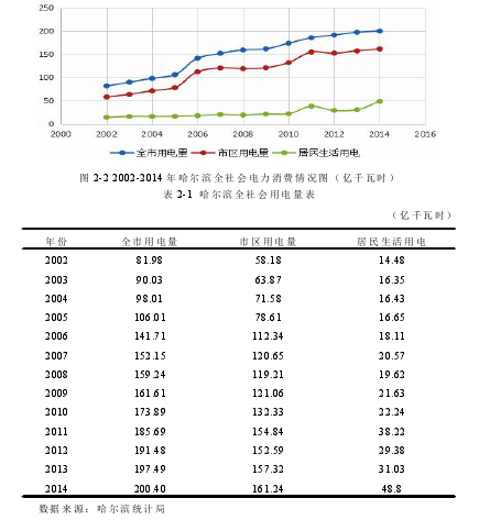 根据图 2-2 和表 2-1,可以发现哈尔滨全社会电力消费量呈现不稳定的发展态势,电力消费量持续上下波动,但电力消费情况总体呈上升发展趋势。2002 年至 2013 年之间哈尔滨全社会电力消费量有很大程度增长,全市用电量、市区用电量和居民生活用电分别从 2002 年的 81.98 亿千瓦时、58.18 亿千瓦时和 14.48 亿千瓦时增长到 2014 年的 200.40 亿千瓦时、161.24 亿千瓦时和 48.8 千瓦时,分别增长了 2.44 倍、2.77 倍和 3.37 倍[23]。