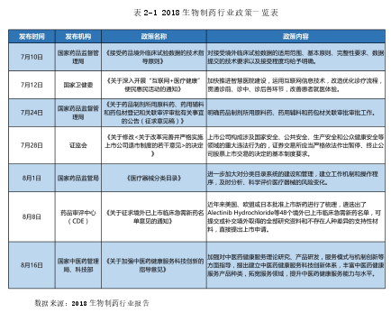自国家“十二五”的规划以来,生物产业已经被列为我国着力培育和发展的七大战略性新兴产业之一。近年来,国家越来越重视生物医药行业的发展,各类生物医药行业的政策密集发布,从中央到地方各级政府都先后出台了一系列的产业政策,大力推动生物医药产业快速发展,各级政府将陆续出台实施了一系列政策,在纳税、社保、融资、产业资金等方面都给予很大的优惠。发布政策的机关主体较多,包括国家卫生健康委、药品监督局、人力资源和社会保障部、商务部、科技部、发改委、工信部等国务院直属多个部门,2018 年就出台了十几项政策,本研究选取其中 5 个政策进行介绍,具体情况如表 2-1 所示[21]。