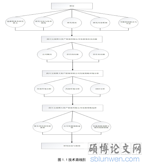 第三章 四川文理博大资产管理有限公司发展现状........................... 12本文遵循“提出问题 - 理论分析 - 问题分析 - 解决问题”的研究框架,首先阐述高校后勤社会化的背景和意义,综述国内外后勤社会化改革相关研究,分析四川文理博大资产管理有限公司发展的现状和存在的问题,结合股东单位的发展愿景和新趋势,提出发展战略选择,最后指出发展战略实施的保障措施。本文的主要内容包括六个部分: