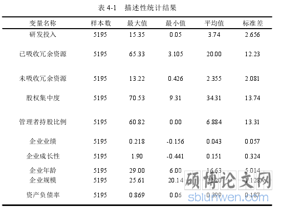 为验证所选样本整体数据的严谨性与合理性,论文使用 Stata14.0 和 Excel数据分析软件对 2014-2018 年中国制造业上市公司样本数据进行描述性统计,每个年度 1039 家上市公司样本,共 5195 个观测值,包含对自变量、因变量、调节变量及控制变量的基本统计量,具体结果见表 4-1。