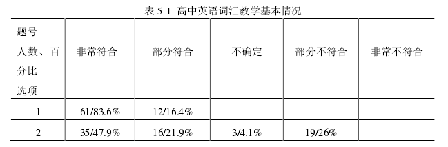 笔者将问卷中的 12 道问题分成 5 个调查维度,下面笔者将逐一进行分析和讨论。调查问卷的 1、2 题是关于高中词汇教学的基本情况。题目 1 是调查词汇教学在英语教学中的重要性,如上表所示,83.6%的英语教师认为词汇教学很重要;剩余 16.4%的教师认为词汇教学比较重要。题目 2 调查在实际教学中词汇教学是否会占有较多的时间。如表 5-1 所示,综合非常符合和部分符合的比率,69.9%的老师会占用大量的时间讲解词汇;26%的英语教师选择占用较少的时间讲解词汇。经笔者深入调查发现,高三年级的教师讲解语法和练习题所占用的时间较多,而高一、高二年级教师讲解词汇所占用的时间较多。因而,在高中阶段,大部分教师都认为词汇教学很重要且在词汇教学上占用的时间较多。