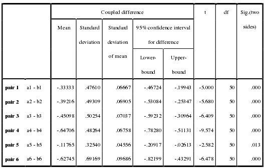 In order to study the changes of students’ writing interest (1-6 questions), the author matched the pre-test data with the post-test data by t-test. The results of the analysis are shown in Table 5-1, 5-2.