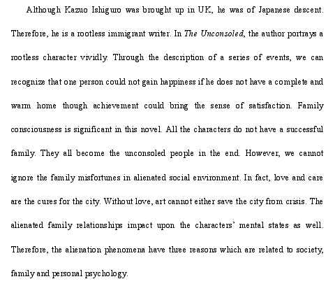 Every family is a unit of society. According to Henri Lefebvre’s spatial production theory, family space is one aspect of social spaces. Family space, as an important space where people can search for warmth and love, not only refers to the physical identity but also the relationships among families. Family relationship can reflect the social situation as well. Family writing is an important narrative tactic to the estrangement and alienation (Wu 176). In The Unconsoled, there are three families who experienced disintegration. The first one is Ryder and Sophie’s family. The members of this family lack good communication and company which leads to the feeling of loneliness. The second one is Hoffman and Christian’s family. Their family relationship lacks mutual trust. The last one is Mr. Brodsky and Miss Collin’s family. This family relationship also lacks mutual understanding and support. The relationships of the three family are estranged and alienated.