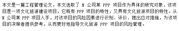总而言之,国外对 PPP 模式的研究在上世纪末就已经开始了,并逐步走向了系统化、正规化。然而风险不管在什么项目上都会存在,同样的,在 PPP 项目中,风险也有一定的探索价值和研究必要。