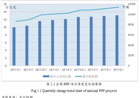 2017 年财政部发布 92 号文。大量不符合监管要求的 PPP 项目被清理整顿,2018 年以后,我国的 PPP 项目走向更加规范化的发展道路。如图 1.1 所示,是根据财政部 PPP 项目库季报的相关信息所整理绘制,该图反应了近 3 年以来我国PPP 项目的季度变化趋势。