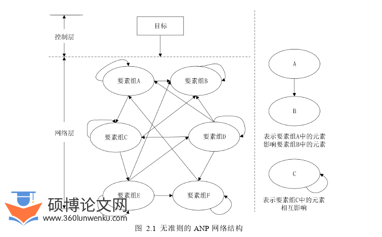 ANP将系统分为控制层和网络层。控制层包括必须存在的目标层和可有可无的准则层,网络层包括受控制层支配的元素组以及相互依存、相互影响的元素,共同形成系统网络结构。ANP计算过程中涉及到超矩阵的运算,一般会选择使用软件或是计算程序来协助计算。无准则的ANP模型如图2.1所示,网络分析法的计算过程与步骤如下: