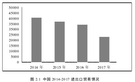 中国进出口贸易逐渐回暖。据海关统计,2017 年上半年,我国货物贸易进出口总值 13.14 万亿元人民币,比 2016 年同期(下同)增长 19.6%。其中,出口 7.21万亿元,增长 15%;进口 5.93 万亿元,增长 25.7%。呈现的特点主要是一般贸易进出口增长、民营企业进出口占比提升。同时“一带一路”战略和跨境电商带动增长迅速。近年来中国进出口趋势地位进一步巩固,2014 年-2017 年的中国进出口贸易情况如图 2.1。