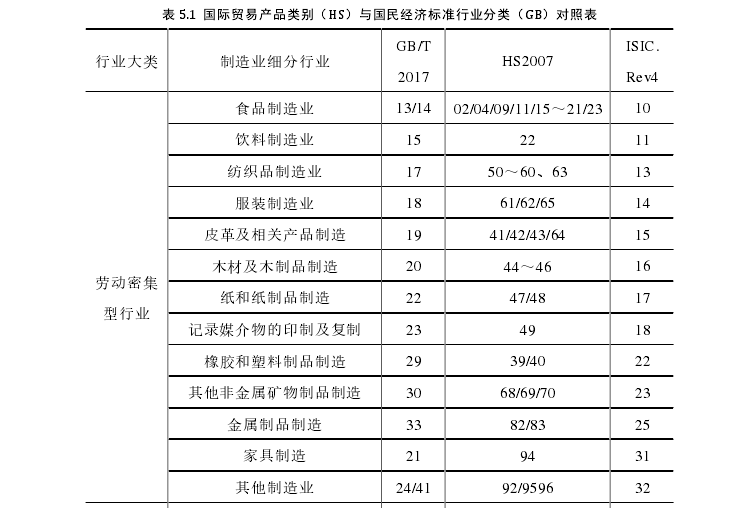 由于我国对于规模以上工业企业的统计范围进行了变更①,为保持数据口径的统一,本文选取了 1990-2017 年 22 个制造业行业面板数据为样本,其中所需的各个行业出口到世界各个国家或地区的数据来源于 UN Comtrade 数据库。UN Comtrade 数据库采用的是国际海关编码(HS),而中国制造业出口采用的是 GB 行业编码,由于货物贸易中出口额是根据产品类别进行分别统计的,为了使制造业各子行业一一对应起来,本文基于由国家统计局提供的国民经济行业分类(GB/T 2017)与国际标准行业分类(ISIC Rev.4)对照表以及由世界银行提供的 HS-2007 编码与国际标准行业分类(ISIC Rev.3)对照表,将两位数的国际贸易产品分类与我国的国民经济行业分类进行了匹配,并根据张其仔、李蕾(2017)对我国国民经济行业分类的方法,将匹配之后的 22 个制造业分为三大类:劳动密集型行业(13 个子行业)、资本密集型行业(4 个子行业)、技术密集型行业(5 个子行业),具体分类结果如表 5.1 所示: