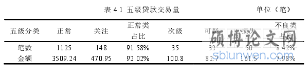 该网点在整个湘潭县农信联社中的各项绩效考核中处于中等位置,位于城乡结合地带,近 5 年来未出现违法发放贷款现象,员工违规操作情况少,具有较强的代表性来估计 TY 农村商业银行的农户小额贷款整体的风险状况。在考虑的期间范围内,该网点在 2011-2015 年这段时期内农户小额贷款的总体交易笔数达1390 笔,整体金额达到 4324.69 万元,涉及到 831 位借款人,依据五级贷款分类法,各类贷款的具体交易笔数如表 4.1 所示: