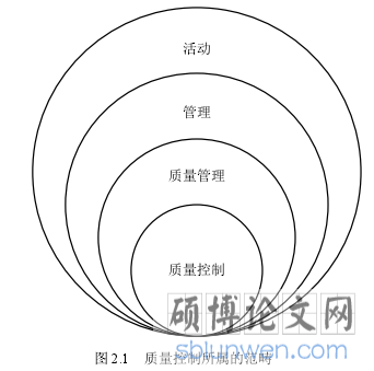 《中华人民共和国国家标准》质量管理体系定义质量控制的基本概念为,“质量控制是质量管理的一部分,致力于满足质量要求”。而质量管理则是通过质量的策划、保证、控制和改进来完成质量目标的过程。由此可以知道质量控制在组织活动的整个体系中所属的范畴如图 2.1 所示。
