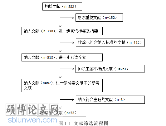 按照检索策略,阅读文献标题及摘要,对文献初步检索,按照纳入与排除标准严格筛查检索到的文献。并进一步获取纳入文献全文,通过人工检索获取文献的参考文献进一步检索,最终对文献进行内容提取、总结,共纳入文献 75 篇。