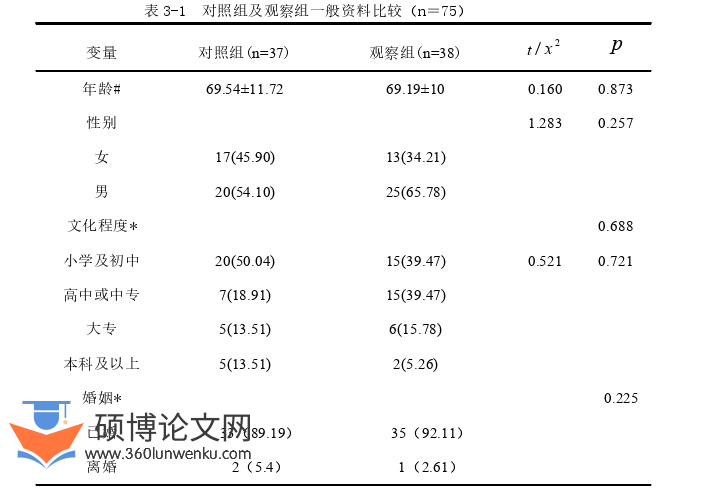 此次研究对患者的一般资料进行分析发现:两组患者的年龄,性别、身高、体重、BMI指数、居住地、文化程度,婚姻状况,职业,医疗支付类型、家族史等比较结果P>0.05,表明两组患者一般资料比较没有统计学意义,组间具有可比性。