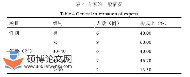 根据专家遴选标准确定函询专家,最终共纳入15名专家,其中本科及以上学历占100%,副高职称占60%,工作年限≥10年的占86.7%,函询专家的工作领域均与本研究相关。一般情况统计使用频数和构成比的方式进行描述,具体结果见表4。