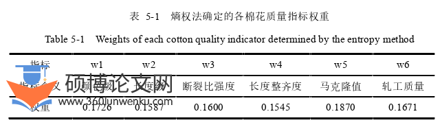 本研究基于2015~2020年57个棉花主产县(区)3832条数据,运用熵权法计算各指标权重,结果如表5-1所示。其中,马克隆值质量指标所占权重最大,为0.1870,说明在所有棉花质量指标中,马克隆值指标的变异程度最高;其次是颜色级指标,权重为0.1726,说明样本中的棉花颜色级差异也较大;变异程度最小的是长度整齐度指标,权重为0.1545,说明各样本间棉花的长度整齐度差异不大;其余的长度级指标、断裂比强度指标和轧工质量指标的权重分别是0.1587、0.1600和0.1671。
