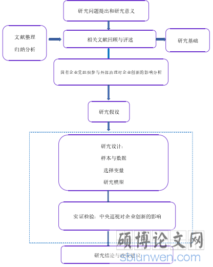 第三章分析理论基础和提出研究假设。本章首先分析党组织参与治理的理论基础,了解参与治理的现状,分析中央巡视对中央企业创新的影响进而提出研究假设。第四章是研究设计。根据研究目的,选择了我国国有上市公司数据为研究样本。根据已有文献研究,筛选所用研究变量,按照条件对相关上市公司进行筛选与剔除,确定本文研究的样本数据,对数据进行处理,然后依据变量构建回归模型。
