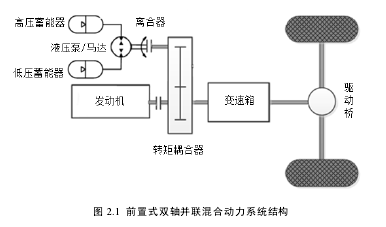 如图 2.1 所示,对于前置式双轴并联混合动力系统,液压泵/马达处于发动机和变速器的中间位置,发动机与液压泵/马达各自输出的扭矩在转矩耦合器合成后,经过变速箱传递到驱动轮。