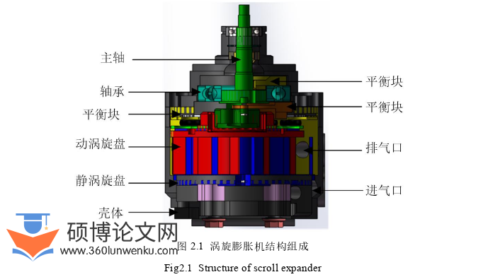 如图2.1,涡旋膨胀机主要由动涡盘、静涡盘、主轴、进排气口、平衡块及机架壳体几部分组成。