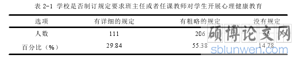 在此次的问卷调查中,85.22%的受访教师表示学校规定班主任或者任课教师对学生开展心理健康教育,其中 29.84%的教师认为学校有详细的规定要求班主任或者任课教师对学生开展心理健康教育(见表 2-1)。根据实地考察,大多数学校在教务处或教研室的教学常规检查工作中强调心理健康教育,规定班主任或者任课教师对学生开展心理健康教育。