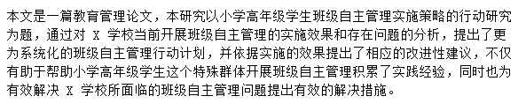 笔者借助于知网、万方、维普等相关专业的文献资料搜索渠道,对相关文献进行了搜索与查阅,通过查阅发现,目前开展班级自主管理行动方面研究的文献仅有两篇,分别为焦悦敬和刘召金撰写的关于初中生班级自主管理方面的行动研究,而尚未发现涉及小学生班级自主管理行动研究方面的文献。小学生作为一个特殊群体,尤其是小学高年级学生作为小学即将步入初中生活的过渡时期,其心理、思想、行为上已有较强的自我认识,开展班级自主管理行动研究,有助于推动和促进自我约束思想和行为的形成,使其能形成较好的学习和自我约束习惯,