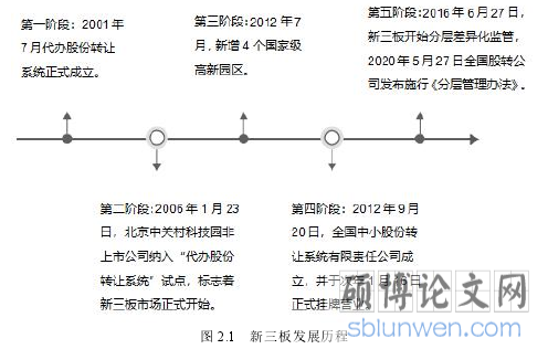 同年年底,证监会宣布新三板面向所有公司开放,并将其服务直径从四个高新技术园区延长到全国范围,打破了空间和地域上的物理限制。正式成为全国性场外交易市场,新三板致力于为非上市提供股票交易、定向融资、并购服务,同时也为市场参与者提供信息、技术培训等其他相关服务。新三板的发展历经五个阶段,如图 2.1 所示:
