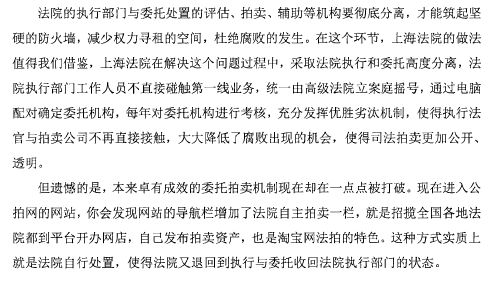 上海地区各级法院对司法拍卖的进行尝试和实践,2004年3月开始,就取得了司法拍卖改革决定性的第一步,当时由上海市髙级人民法院对上海全市法院司法拍卖进行统一管理,集中委托,执行权与委托权实现“两权分离”。真正开始互联网化是在2009年,在上海法院、政府等主管部门的指导下,拍卖协会带头组织开发打通线上线下同步拍卖的专门平台一一“公拍网”,实现了线上线下的同步拍卖。2011年11月15日,专门成立了上海市公共资源拍卖中心,将除了司法拍卖以外的公物、罚没物资等资产的处置都纳入到处理的范围。2015年起,随着互联网化力度的加大,又新推出了72小时预先竞价的前置模式,并且成功对接各大商业银行,实现了对竞价资金的安全监管。