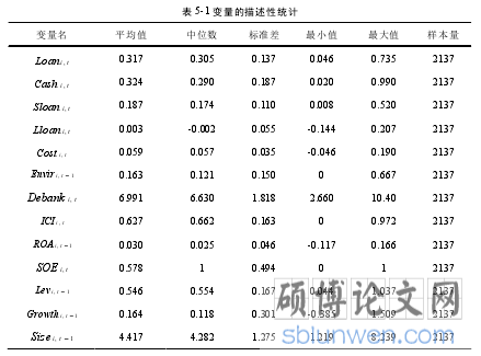 表 5-1 列示了各变量的描述性统计情况。从贷款总额规模上看,Loan 的均值和中位数仅为 31.7%和 30.5%,而从 2011 年到 2018 年,贷款规模占全社会融资规模比例年均高达 65.46%(数据源于国家统计局网站)的比例来说是比较低的,表明重污染行业在信贷市场中,银行对其信贷投放相对谨慎,绿色信贷政策或许起到了一定的约束效果。从新增贷款的期限结构上看,Sloan 和 Lloan 的均值为 18.7%和 0.3%,中位数为 8.26%和-0.2%,说明银行对重污染企业的贷款投放是以短期贷款为主,而对长期贷款更为慎重。从贷款成本来看,Cost 的极大值为 19%,极小值为负,均值为 5.9%,代表重污染行业上市公司的债务成本存在较大差异。由此可见,高污染企业的贷款可获得性是明显受限的,银行在信贷配给时可能确实已关注到企业的环境信息。此外,从环境信息披露质量上看,Envir 的均值和中位数分别为 0.163 和 0.121,还不足 0.5,根据本文的赋值评分规则,说明这些重污染行业的上市企业披露的环保信息普遍以定性披露为主,且披露并不完整。