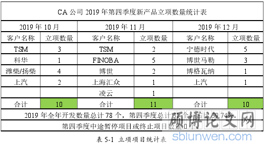 CA 公司自 2019 年 9 月开始实施以上项目管理优化策略,为了体现效果的真实性,我们将 2019 年 10 月、2019 年 11 月、2019 年 12 月新项目数量进行统计,如图表 5-1 所示: