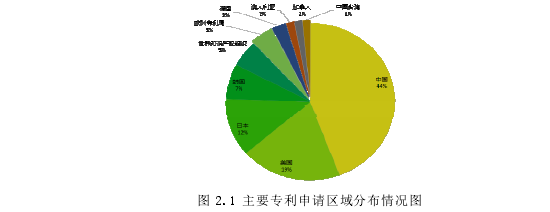 通过对国内外卫星导航产业专利进行检索,可以得到卫星导航产业专利申请的主要国家和地区申请情况分布,从图 2.1 可以看出,全球卫星导航产业专利申请区域主要分布在中国、美国和日本,占比分别为 44%,19%和 12%④。