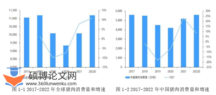 (1)中国生猪产业的发展历来备受关注。生猪产业主要是指养猪业及其相关的上下游配套产业,通过上下游紧密合作实现生猪生产与猪肉供给。生猪产业是我国农业支柱性产业之一,在稳定经济和社会发展方面具有举足轻重的作用,自古就有“猪粮安天下”之说[1]。自改革开放以来,中国畜牧业经历了迅猛发展,对于满足城乡居民对动物蛋白的需求起到了重要的作用[2]。中国是世界第一产猪大国,目前,中国居民消费最多的肉类还是以猪肉为主[3]。FDA数据显示,2021年全球猪肉消费量约为10.085万吨,同比增长约8%,这一数据在2022年突破了11.000万吨。根据经济合作与发展组织及联合国粮食及农业组织的资料,中国肉类消费的主要类别包括猪肉、禽肉、牛肉及羊肉。2021年人均消费猪肉26.5公斤左右,占主要人均肉类总消费量的53.9%。2021年国内共消费猪肉接近5200万吨,约占全球猪肉总消费量的50%,2022年突破5500万吨,猪肉严重影响着国民经济和生活质量。如图1-1、图1-2所示。