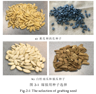 以嫁接苗亲和性、成活率、抗病性和抗寒性为目标,接穗种子选用京研绿玲珑黄瓜和京欣 4 号西瓜,砧木种子选用京欣砧 8 号白籽南瓜和京欣砧 1 号瓠瓜,这些种子在北方地区种植广泛。其中,黄瓜与白籽南瓜、西瓜与瓠瓜进行配对嫁接育苗,如图 2-1a、2-1b 所示。