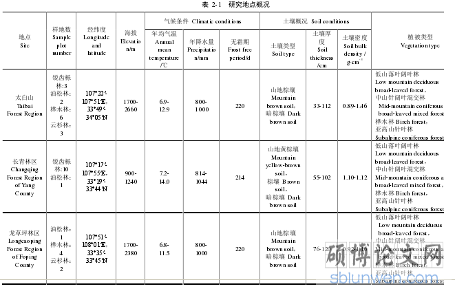 秦岭位于我国中部,是我国重要林区之一。分别在陕西太白县太白山林区、洋县长青、佛坪县龙草坪、宁西林业局和宁东林业局选择锐齿栎样地 27 块,油松样地 20块,桦木类样地 18 块和云杉样地 11 块,这些试验地都集中在秦岭植被较好的中西部地区(33°13′- 33°46′N,107°21′- 109°32′E),海拔范围 900-2670 m,土壤类型为棕色森林土。气候为亚热带湿润气候和亚热带山地气候,各研究区概况见表 2-1。