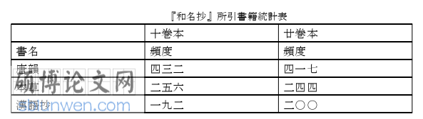 第四章の第四節「所引書名の統計と分析」で、林忠鵬は『和名抄』に引用された典籍をデータベース化にし、「十巻本引用典籍の頻度」と「二十巻本引用典籍の頻度」が掲載されている。その結果によると、『十巻本箋注本倭名類聚抄』(以下『箋注本』と略す)所引書名は延べ三千九百九十四例、異なり四百六十五種であり、廿巻本(那波道圓本)所引書名は延べ三千九百九十六例、異なり四百七十五種である。