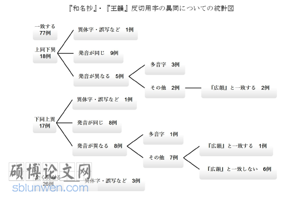 それから、その逸文を音注と義注に分けて、中国の切韻系韻書と比較した。『和名抄』所引『唐韻』系逸文の音注と『王韻』での 30 例の内容と比較した。反切上字も反切下字も同じであるのが 15 例であり、全例の半分を占めている。異体字の 2 例を同じである場合に見なすと、その比率は 56.67%となり、総数の半分を超えている。また『和名抄』所引『唐韻』系逸文 252 例の音注と『広韻』での内容と比較した。252 例のうちに、15 例は『広韻』で注されていた音と異なり、全例の 5.95%を占めている。27 例は『広韻』で見つからなく、全例の 10.71%を占めている。残りの 230 例は『広韻』で注されていた音とは全く一致しており、全例の 91.27%を占めている。義注から見ると、『王韻』と一致する例は 24 例で、全例の 36.36%を占めており、『広韻』と一致する例は41 例で、全例の 62.12%を占めている。『和名抄』を編纂する際に底本として参考した材料の性格は、『広韻』とは極めて近いと推測できる。反切用字が全く異なる例を比較すると、6 例のうちに、4 例の反切用字は『広韻』にも出ており、1 例の反切上字は『広韻』から転写される際の誤写だと思われ、1 例は発音が『広韻』と同じであるということが分かる。また、その 6 例の中に 5 例の解釈は『広韻』に探せることができる。『和名抄』と『広韻』を編纂する際に、参照する『唐韻』の底本が異なると推測できる。そして、『和名抄』が編纂される際にその底本として参照したのは『唐韻』ではなく、『広韻』またはその後世の韻書である可能性があり、参照した底本は一つとは限らなく、その後世の韻書からの孫引きがあると推測できる。