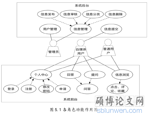 根据高校头条系统按照角色的不同,在前台展示子系统和后台管理子系统的功能作用如图 5.1 所示。