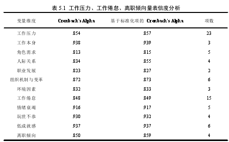 本文利用 SPSS20.0 对正式调查中所采用的工作压力、工作倦怠、离职倾向量表进行 Cronbach's Alpha 系数信度分析。如表 5.1 所示,工作压力、工作倦怠、离职倾向的 Cronbach's Alpha 系数都在 0.8 以上,而且其各个维度的 Cronbach's Alpha系数也均在 0.8 以上,则验证该三个量表均具有较好的信度。