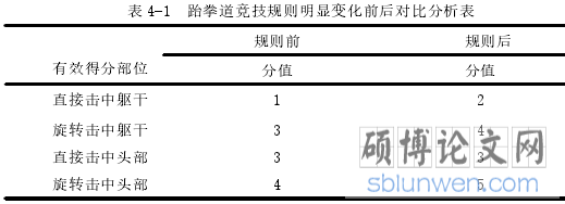 表 4-1 跆拳道竞技规则明显变化前后对比分析表