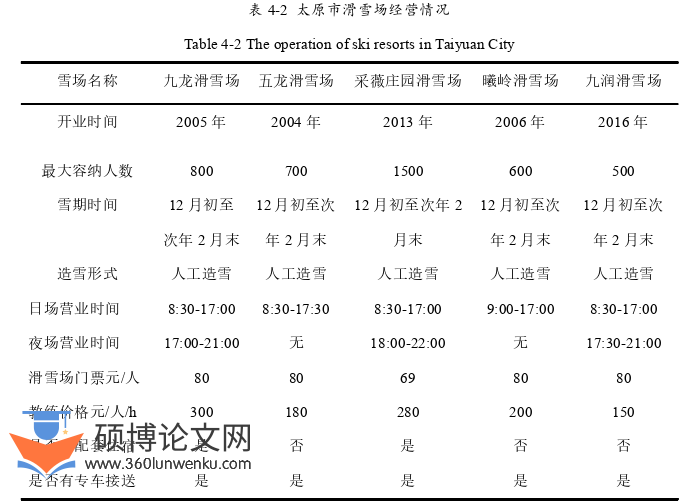 通过实地调查法、山西省体育局官网、太原市体育局官网等等途径的实地走访调查、电话咨询。由图4-1可知,太原市滑雪场主要分布在小店区、杏花岭区、万柏林区、晋源区。其中小店区有五龙滑雪场和九龙滑雪场,杏花岭区有采薇庄园滑雪场和曦岭滑雪场,万柏林区有九润滑雪场。其他县市地区均无滑雪场,从整体上讲,太原市地形地貌开阔平坦,地理位置、交通条件得天独厚,经济实力较强,从距离上看滑雪场距离市区稍远,分布不均匀。其中五龙滑雪场是太原市第一家上规模、上档次的滑雪场,于2004年开业。采薇庄园滑雪场是一家休闲度假的四季滑雪胜地,占地5万余平方米雪场面积4万平方米,雪道面积3万平方米,造雪面积90000平方米,儿童戏雪区面积1万平方米。曦岭滑雪场由国际滑雪协会设计,落差为129米。并且引进了国外先进的造雪系统,并且具有国际领先设计水平的W型雪道。九龙滑雪场占地8万平方米。拥有最强的滑雪条件和专业技术实力,在该国主要滑雪胜地中名列前茅。九润滑雪场占地面积约为5万平方米,是离市区最近的大型户外滑雪场。参考中国索道协会发布的《旅游滑雪场等级划分》中的滑雪道、滑雪具、索道、滑雪场救护、滑雪场安全防护等等标准对太原市滑雪场进行划分,其中采薇庄园滑雪场、九龙滑雪场达到S级雪场的标准,曦岭滑雪场、五龙滑雪场、九润滑雪场规模相对较小,不具备等级评定资格。