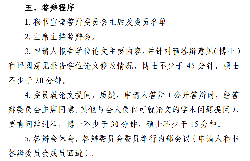 博士(硕士)学位论文答辩委员会由不少于7(5)名来自博士授权单位的博士生导师组成,所有委员应是教授(副教授)或相当职称,其中至少包含2(1)名本校和学位申请人所在单位以外的同行专家,专业学位答辩委员会应有1名实际工作部门或企业部门的专家。答辩委员会主席应由校外专家担任,应是该研究领域有较深造诣的博士生导师,且至少完整培养过一届博士生。申请人导师不能作为答辩委员会成员,不得参加申请人的答辩过程。培养单位要严格按照论文答辩程序,保证充足的汇报、质疑和答辩时间,博士生(硕士生)答辩时间不能少于2(1)小时。