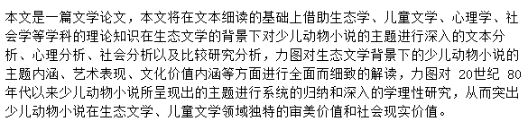 不同程度的成长。当然少儿动物小说的主题呈现并不仅限于这三个方面,我们在这里只是对作品表现出来的最基本的三个主题进行分析和讨论,少儿动物小说其它丰富的主题内涵仍待我们去不断地发掘和研究。